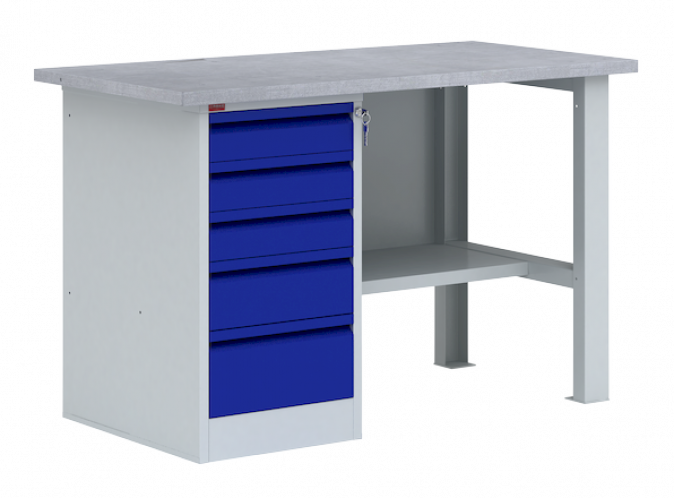 Верстак ВП-3 состоит: столешница из МДФ, покрытая оцинкованным листовым металлом; стенка задняя металлическая; металлическая верстачная опора; тумба с 5-ю выдвижными ящиками на телескопических направляющих (нагрузка до 30 кг) запирающимися на центральный замок; полка верстачная (нагрузка до 40 кг). Тумбу можно установить как с левой, так и с правой стороны верстака. Верстак может комплектоваться перфорированным экраном соответствующего размера с возможностью крепления крючков и держателей для инструмента